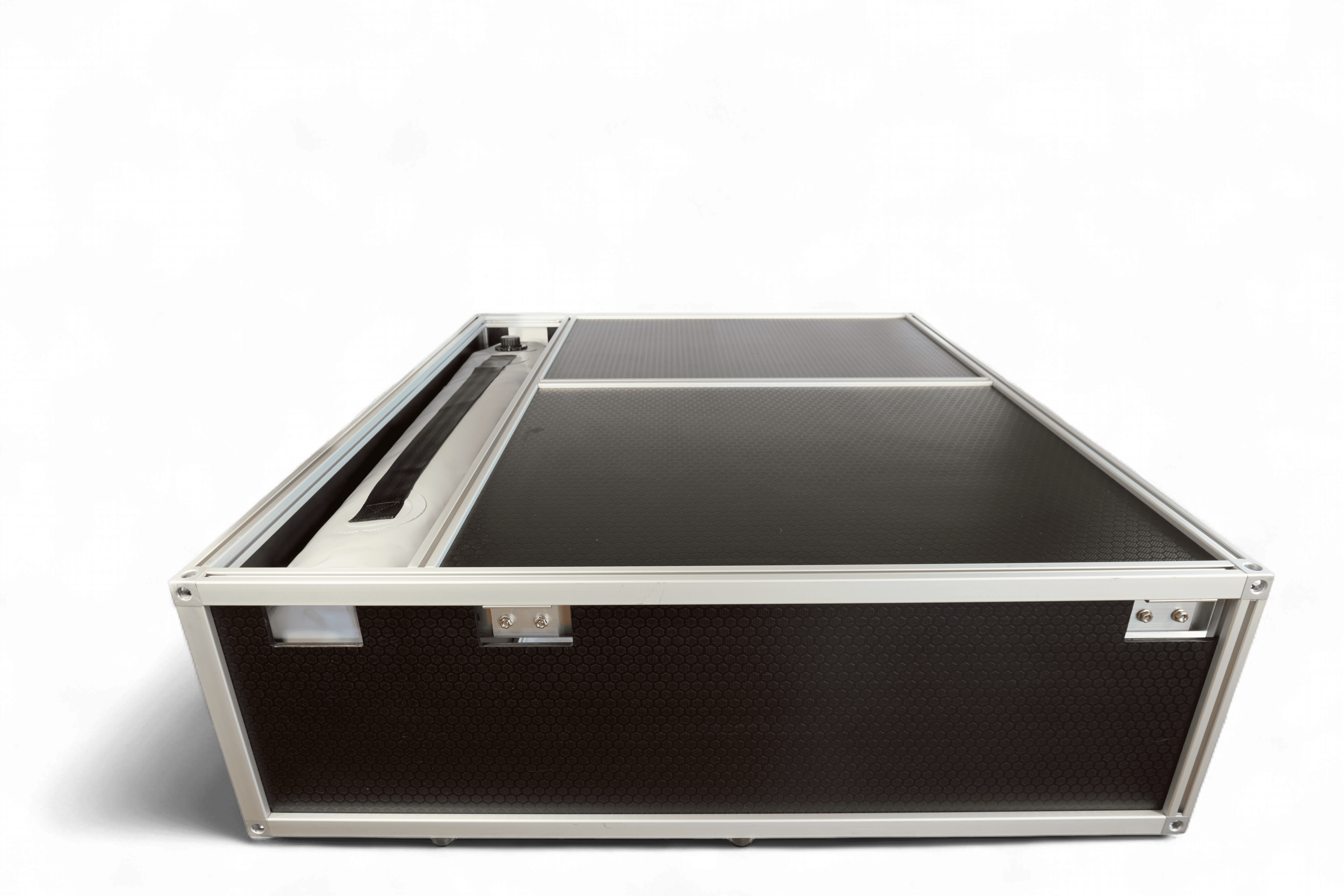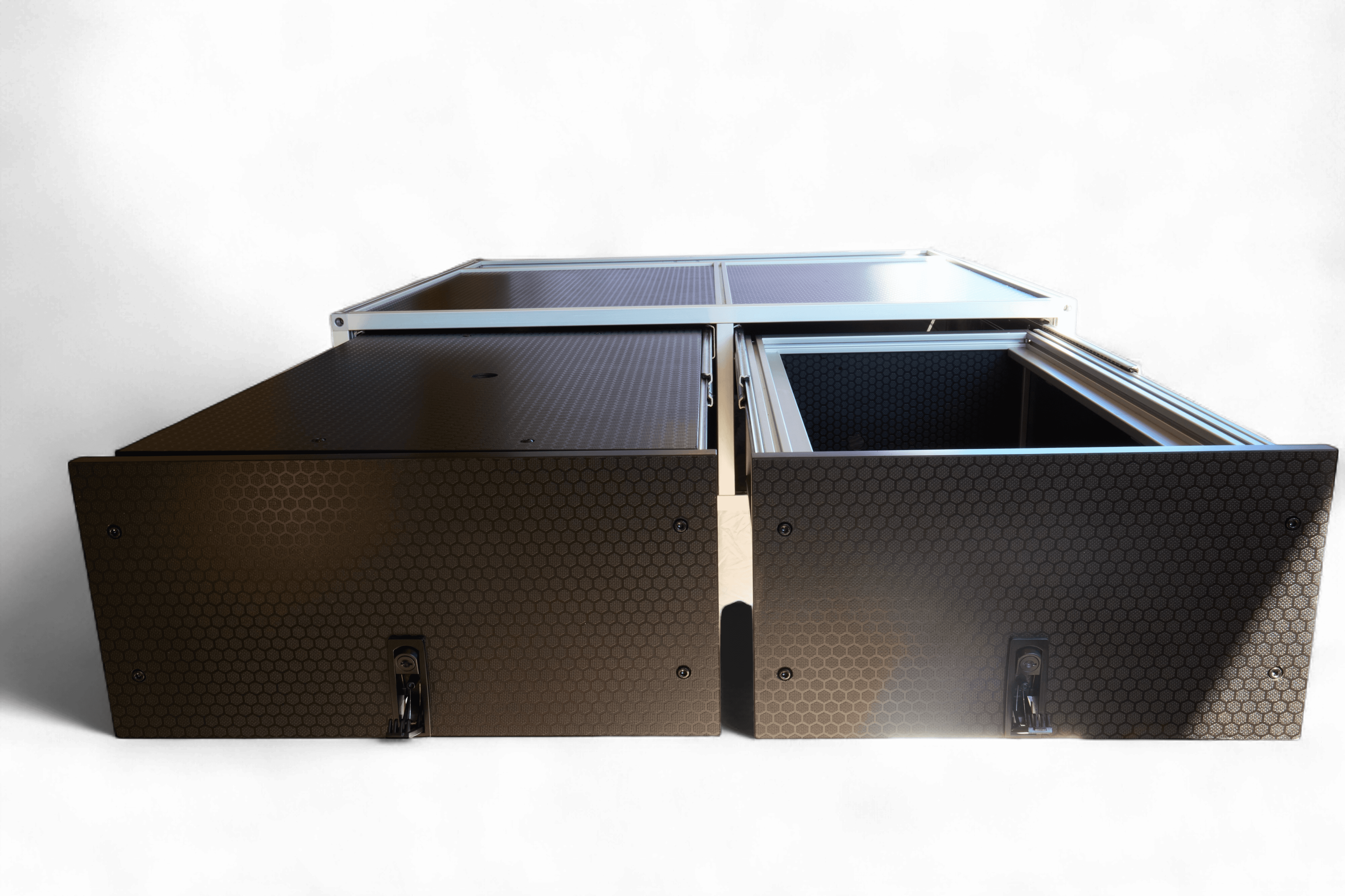Slides over 3rd row seat for 7-seater*, tethers to false floor (*or factory tie downs) for 5-seaters. Under-platform module replaces plastic OEM box. Currently the only full-expedition option with IGT kitchen module for the 7-seater Prado. As with all our systems it can be removed in minutes to restore the car to more mundane duties.