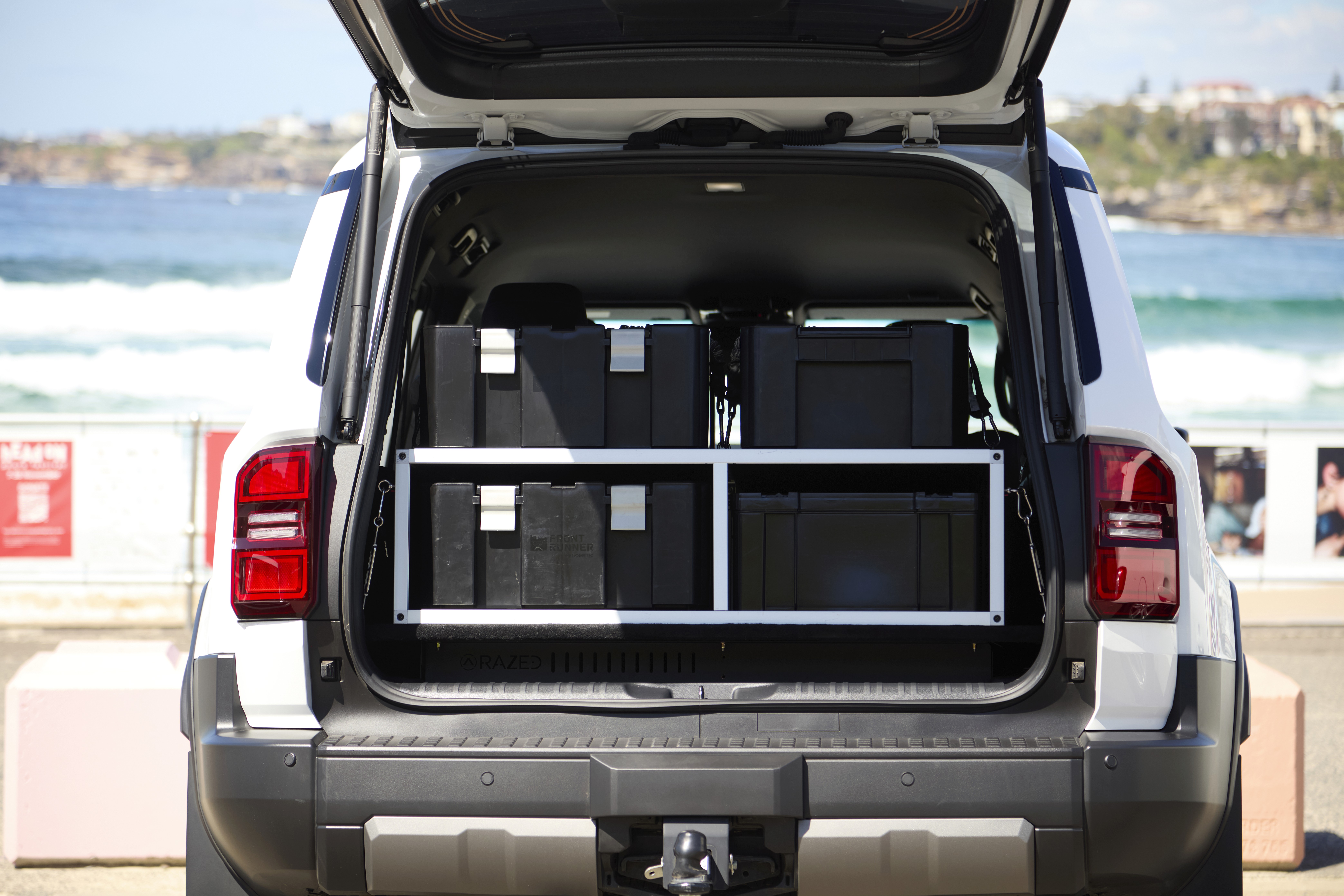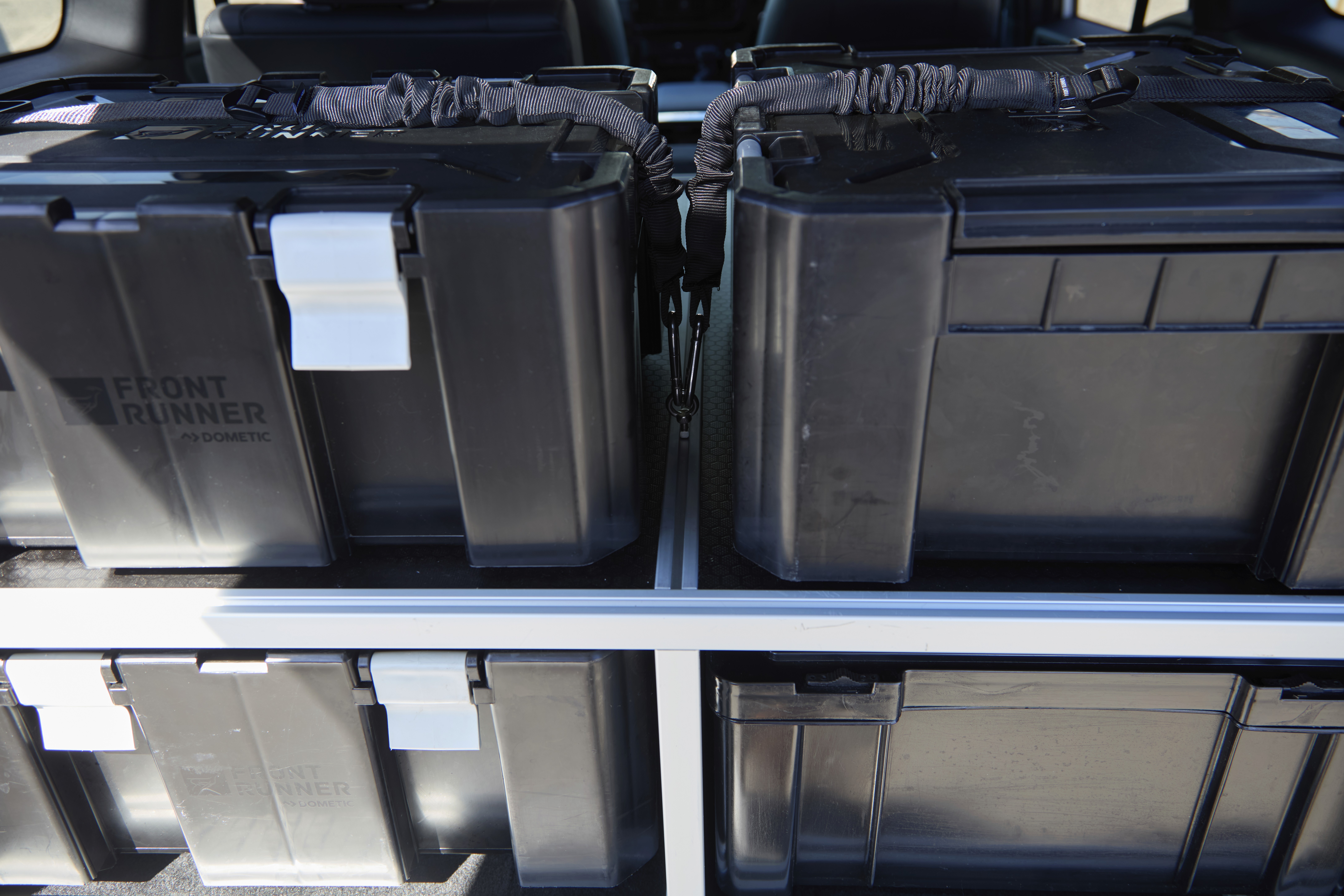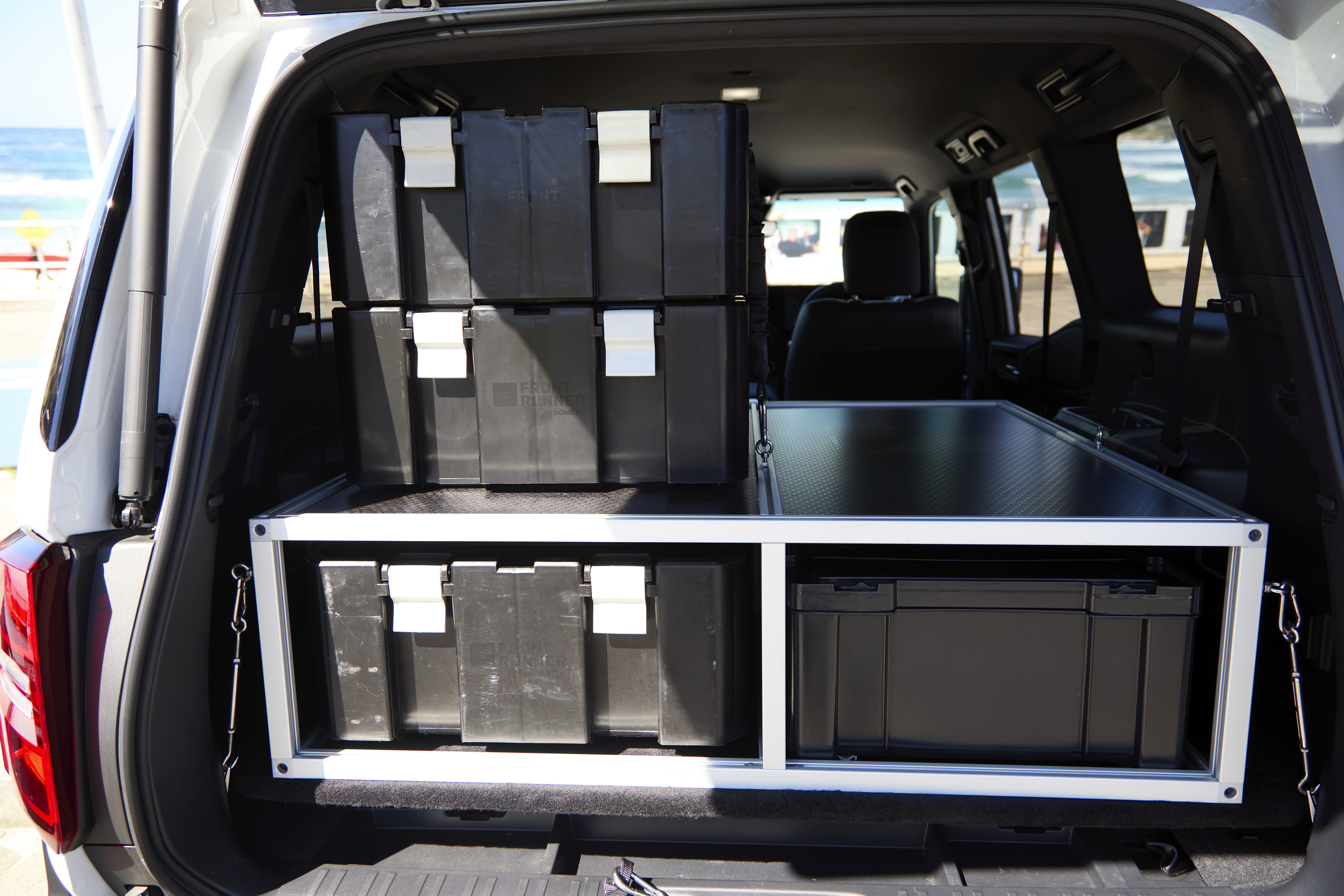 Engineered to house popular storage boxes in a stacked configuration, with easy access to two boxes on both the left and right hand sides. Further storage can be tethered to top of the platform.
