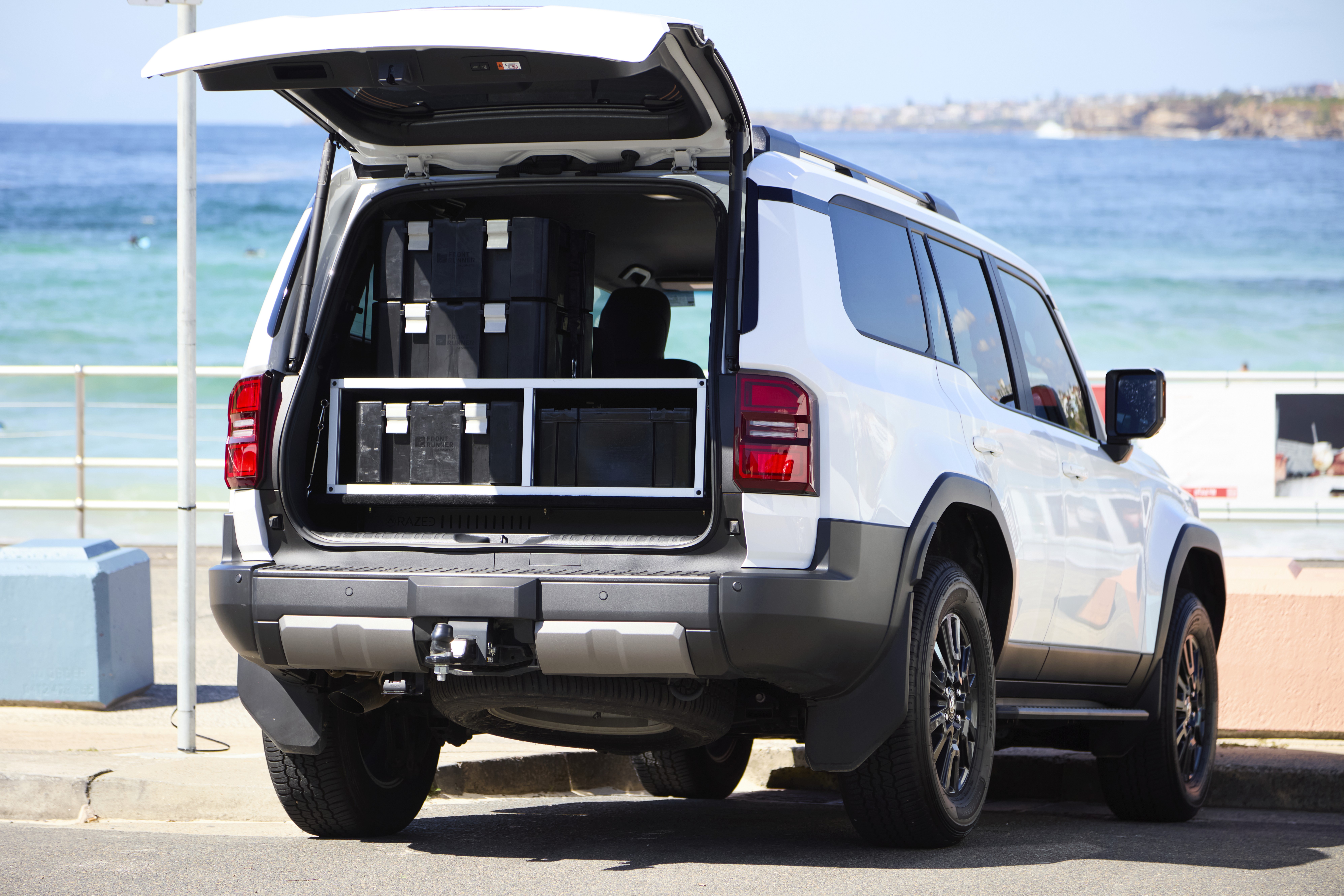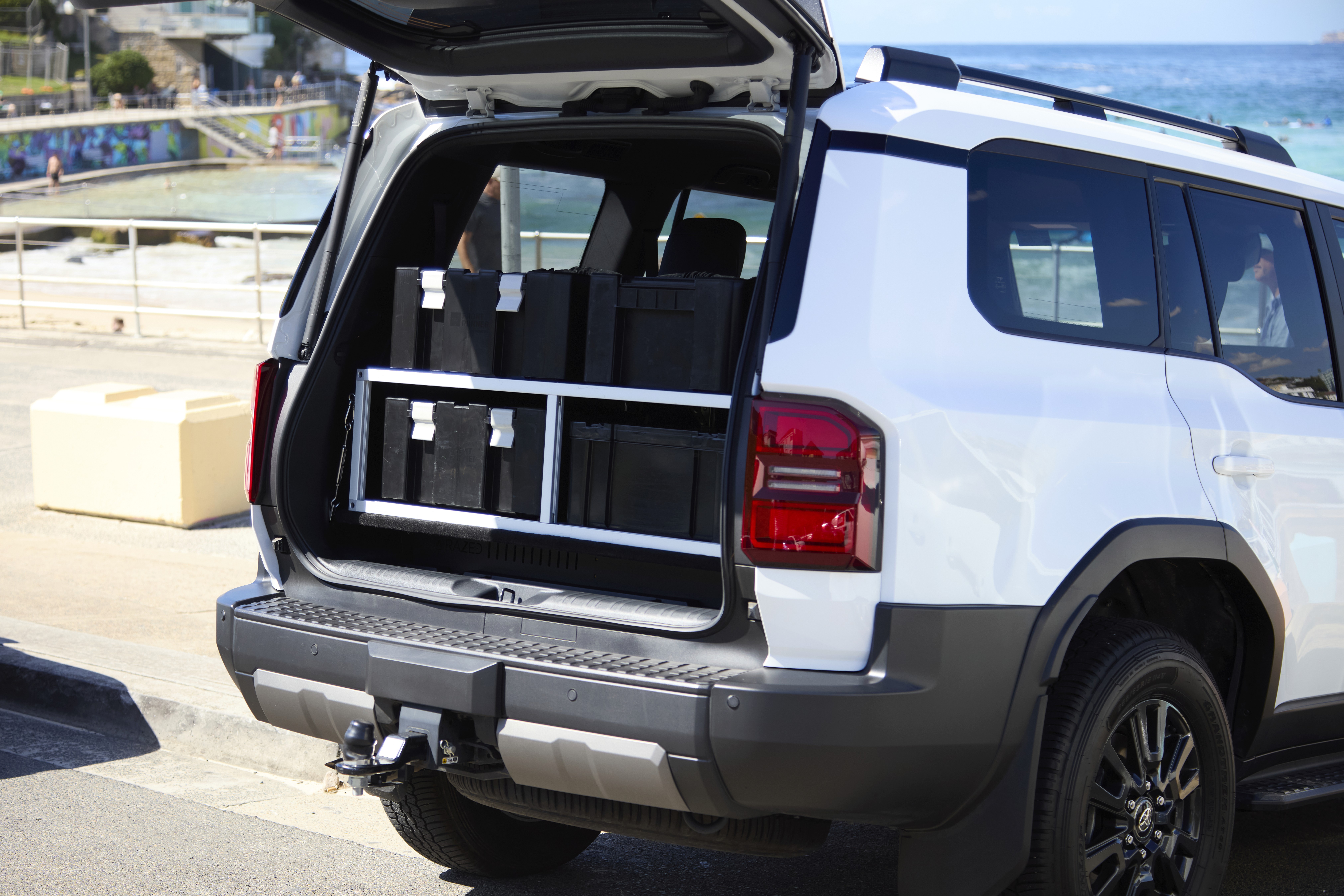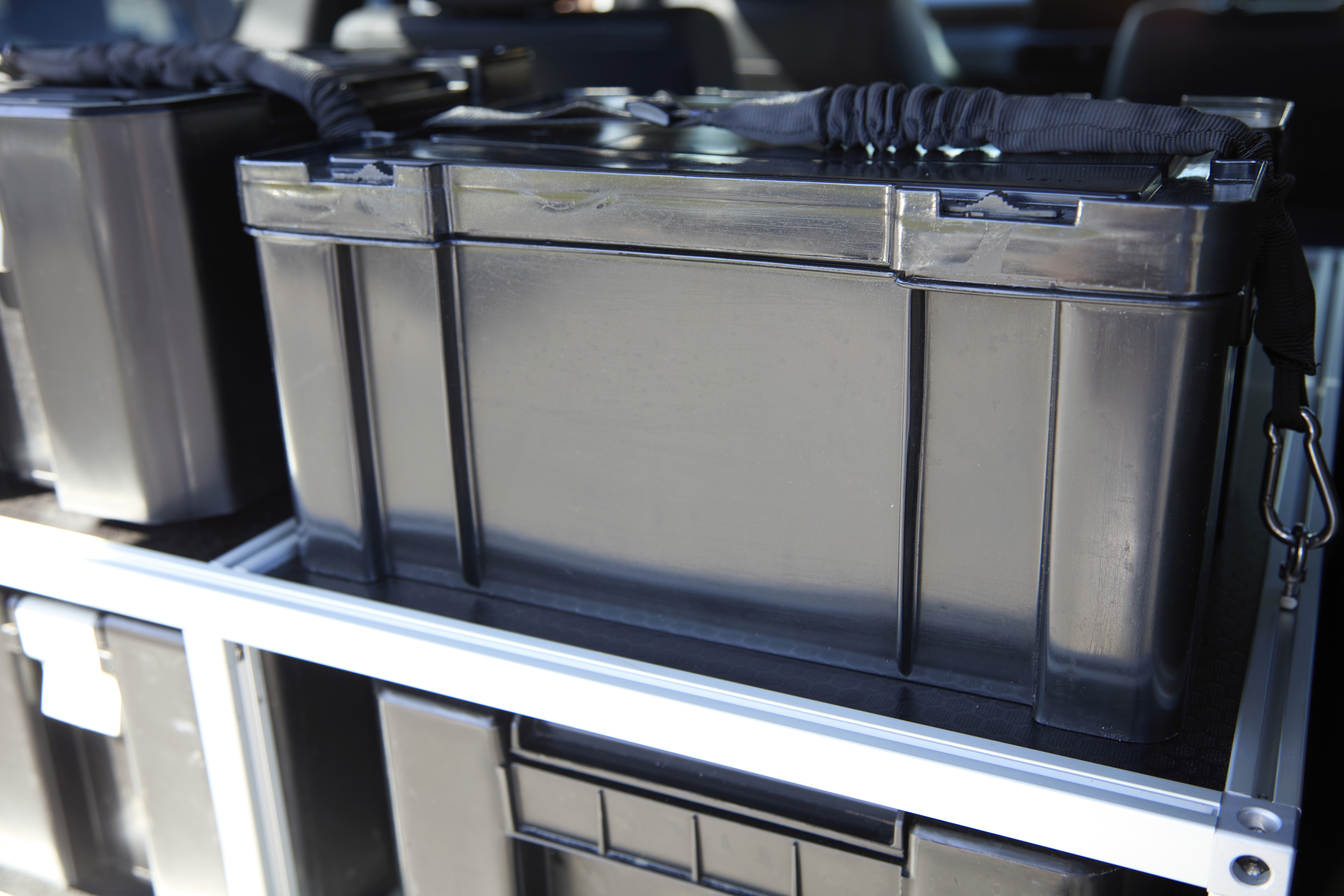 Engineered to house popular storage boxes in a stacked configuration, with easy access to two boxes on both the left and right hand sides. Further storage can be tethered to top of the platform.